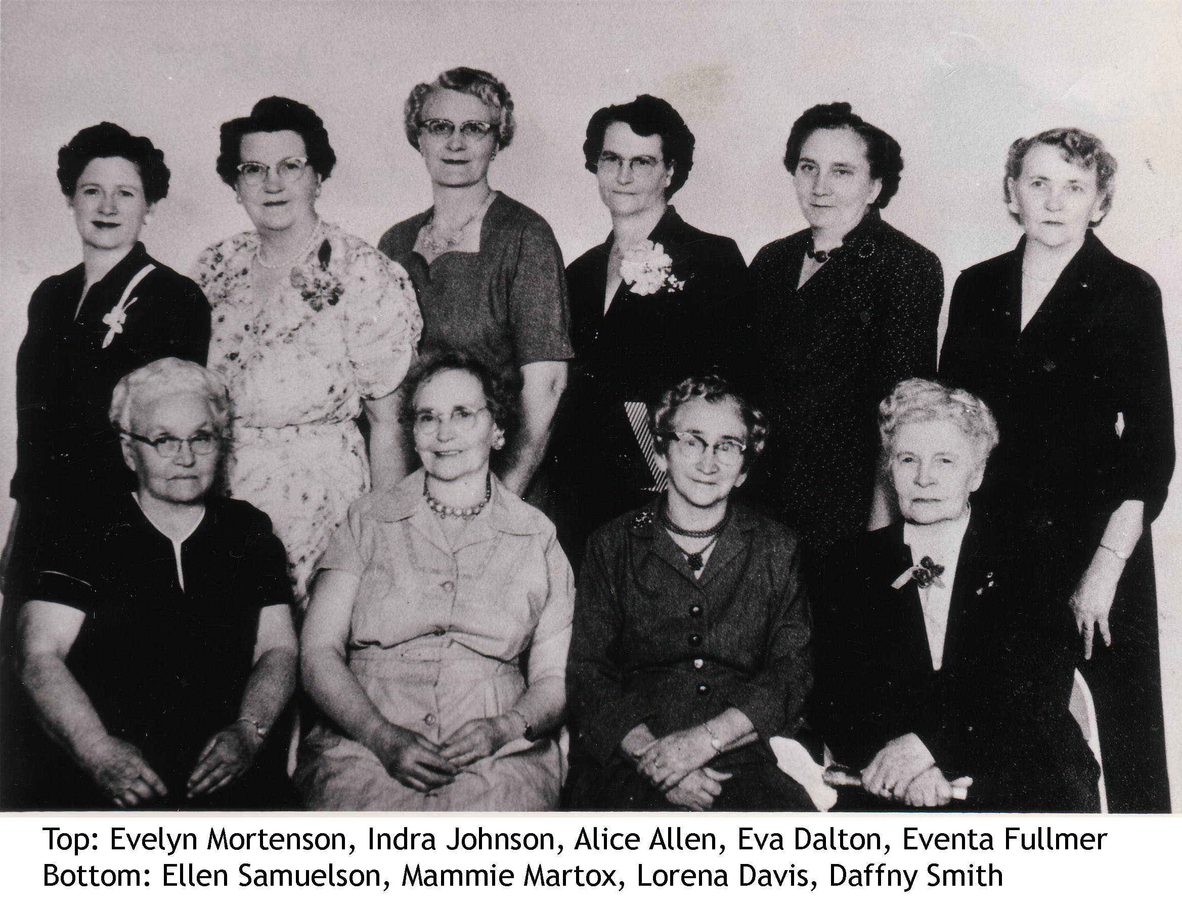 back row: Evelyn Mortenson, ?, Alice Allen, Eva Dalton, Eventa Fullmer, Lois Haycock